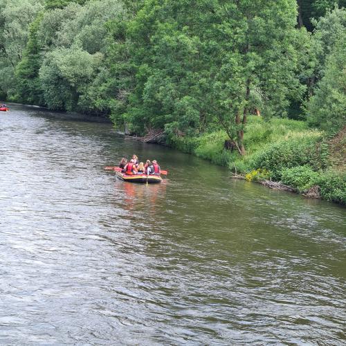 Nach über einem Jahr Pause konnten wir an diesem Wochenende wieder ins Vereinsleben starten. Den Auftakt machte eine zweitägige Paddeltour mit dem Schlauchboot auf der Saale. Am Samstag trafen wir uns auf der Festwiese in Rudolstadt - naja, zumindest dort ganz in der Nähe. Es dauerte ein Weilchen, bis wir uns alle gefunden hatten, aber dann konnte es nach kurzer Einweisung schon losgehen. Die Teilnehmenden wurden auf die Boote verteilt und bekamen Aufgaben zugewiesen. Hinten Steuermann oder -frau, an der Seite die Paddelsklaven und an der Spitze das Bugschwein, dessen Rolle es war, nach Untiefen, scharfen Kurven und Hindernissen Ausschau zu halten. Selbstverständlich wurden die Plätze auch mal getauscht, damit am Abend alle müde Arme haben!